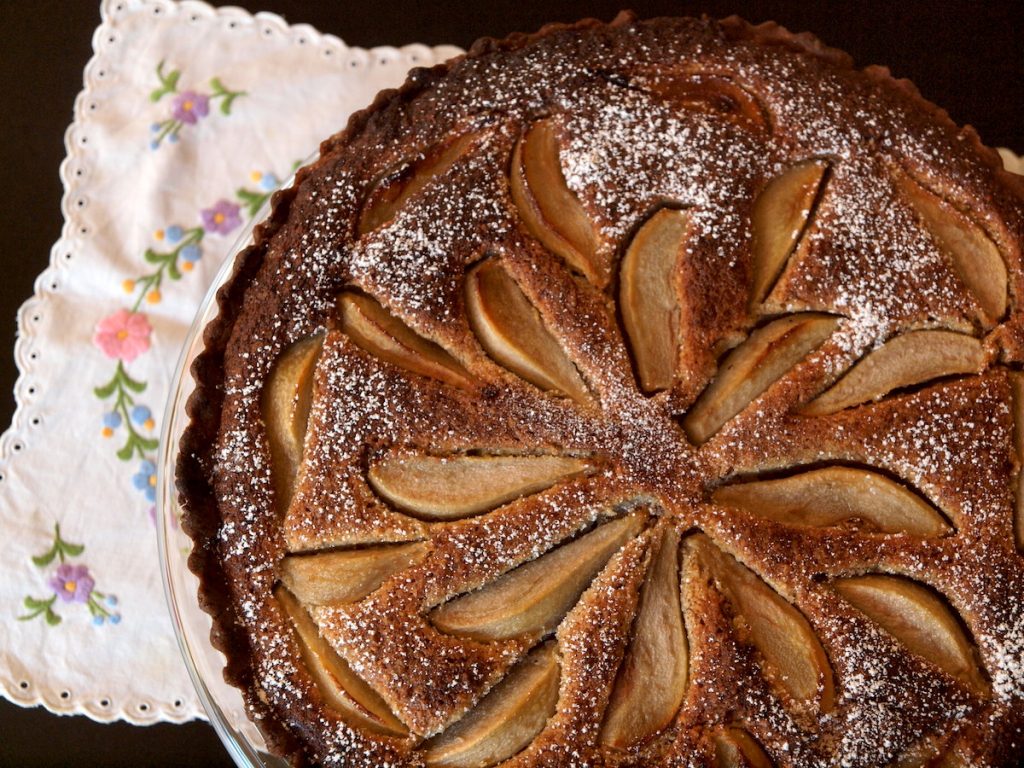 Ein Kuchen, inspiriert von Jamie Olivers Pflaumen-Mandel-Tarte, aber deutlich reduziert in der Buttermenge (um 30 %) und vor allem auch beim Zucker (um 50 %) – und trotzdem ist er noch süß genug. Die Tarte hat eine leckere Mandelfüllung, die die zarten Birnen umgibt, und einen wunderbar knusprigen Mürbeteig. Mein Sohn macht sich noch Vanille-Schlagsahne dazu – der kann sich das aber auch leisten…