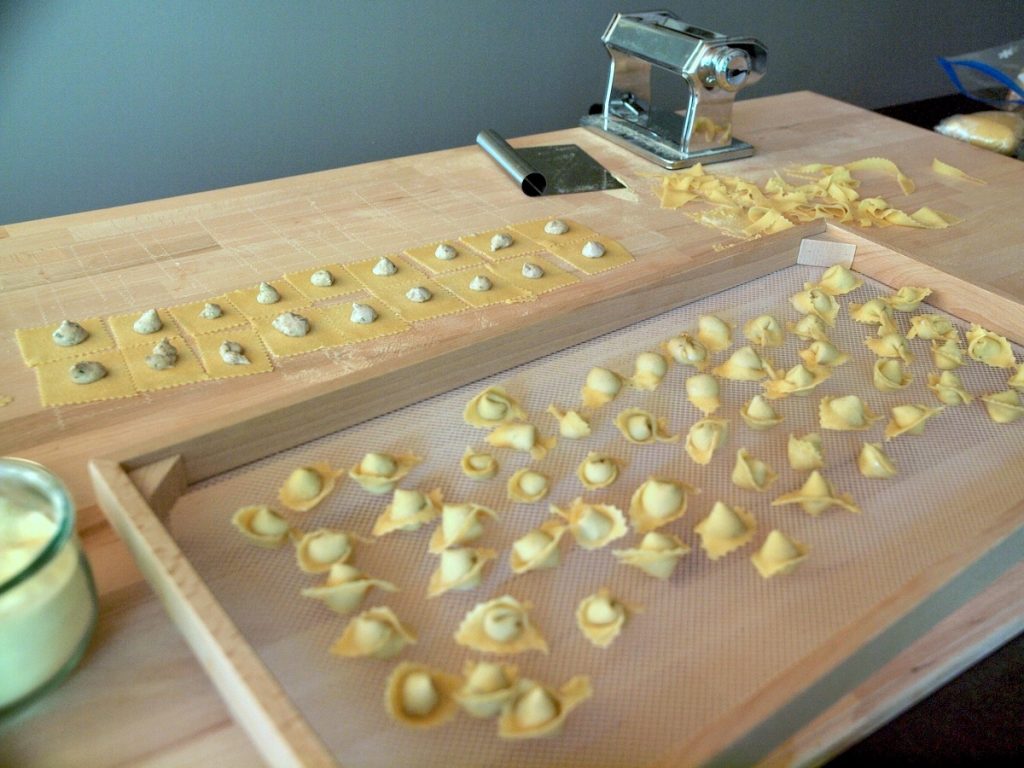 Den Nudelteig mit der Maschine zu dünnen Bahnen (1 mm Dicke) oder mit dem Nudelholz zu einer dünnen Platte ausrollen. Auf Semola auslegen und mit einer Folie bzw. einem aufgeschnittenen Gefrierbeutel zudecken, damit der Teig nicht austrocknet. Je nachdem, was man kann oder bevorzugt, formt man Ravioli oder Tortellini oder Cappelletti.