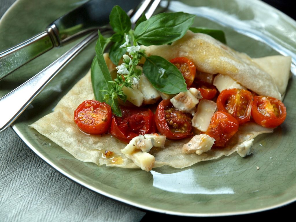 Pfanne erhitzen, Fett dazu und die Crêpes nacheinander backen und zusammenfalten. Eventuell im Backofen warmhalten. Mit den karamellisierten Tomaten und Gorgonzolastückchen belegen, darauf Basilikumblätter (und Blüten) legen, mit etwas Öl aus der Auflaufform beträufeln und servieren.