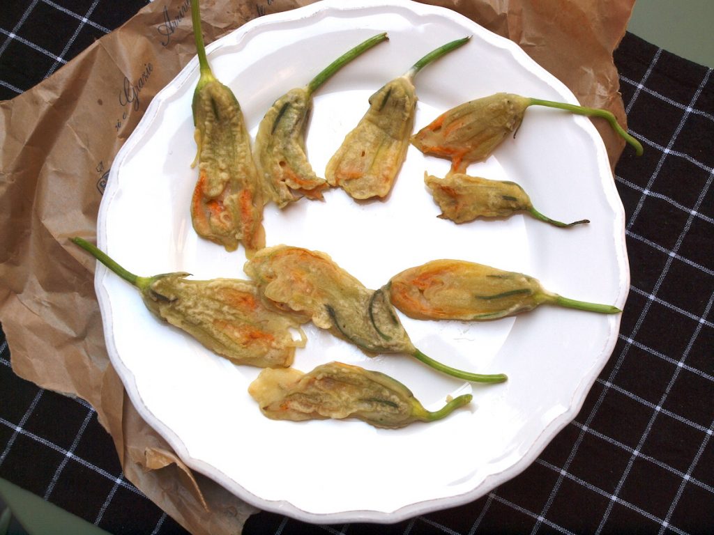 Zucchiniblüten in ausgebackener oder gefüllter Form sind einfach delikat. Zum Füllen eignen sich eher die größeren Exemplare. Mit den kleineren Blüten kann man im Handumdrehen einen wunderbaren Leckerbissen als Vorspeise oder Gruß aus der Küche zaubern. Die Blüten gibts auf dem Gemüsemarkt oder im Garten.
