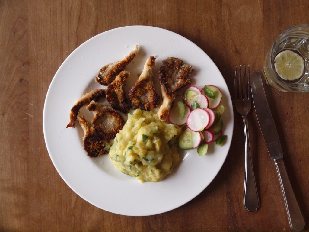 Für den Stampf habe ich Kartoffeln und Petersilienwurzel genommen, die ihn etwas süßlich macht und außerdem viel Kalzium, Eisen und Vitamin C enthält, und mit Knoblauch und Petersiliengrün aromatisiert. Einfach ein delikates Essen!