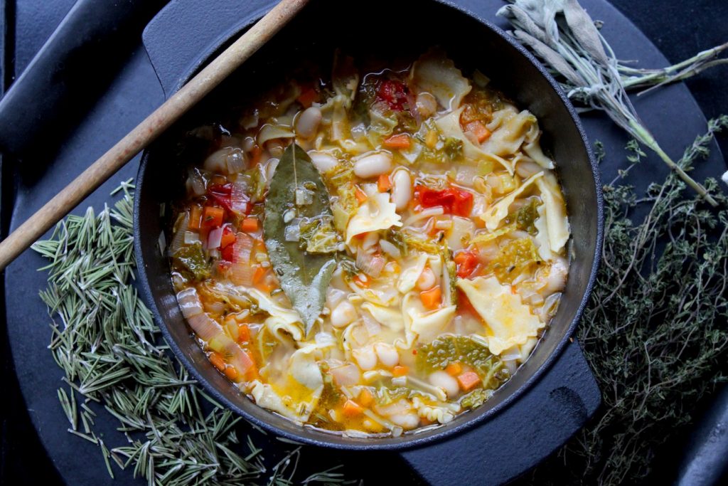 Bei uns jagt man im Moment keinen Hund vor die Tür. Der Schnee schmilzt, und der Regen setzt noch eins von oben drauf. Lecker! In solchen Fällen lohnt sich ein Blick in den Kühlschrank nach verwertbaren Gemüseresten und in den Vorratsschrank nach einer Dose Cannellini-Bohnen sowie Nudeln. Bei uns haben sich nach den Pastakursen einige getrocknete Nudelreste vom Ravioli-Ausrollen angesammelt, die auf diesen Moment nur gewartet haben. Jetzt kommt ihr Auftritt in einer einfachen, dennoch sehr schmackhaften Suppe, die in Italien eigentlich ein Klassiker ist: Pasta e fagioli.Ich habe dann doch noch 2 Wirsingblätter und einen halben Porree mit hineingeschmuggelt.