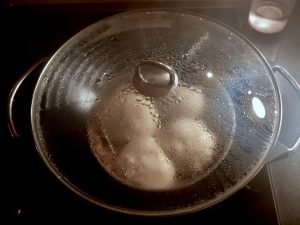 Den Topf vorbereiten. Ich habe meinen Wok mit Deckel genommen und einen normalen Dampfeinsatz. Backtrennpapier in der Größe des Dampfeinsatzes zurechtschneiden und hineinlegen. Auf den Topfboden ca. 100 ml Wasser gießen. Der Dampfeinsatz soll sich über der Wasseroberfläche befinden.