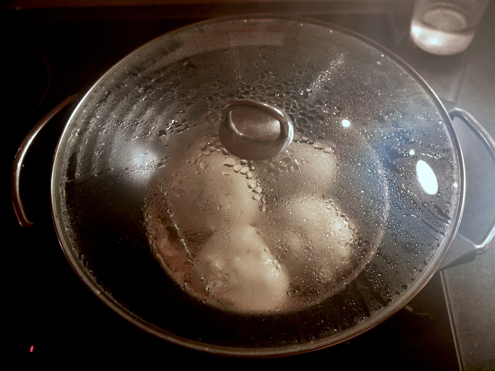 Die Teigtaschen portionsweise in den Dampfeinsatz setzen, ohne dass sie sich berühren, sie gehen noch auf. Ich konnte so immer 4 Stück gleichzeitig garen. Nun das Wasser zum Kochen bringen und alles 8 Minuten dämpfen. Danach die Buns herausnehmen, auf einen Teller legen und möglichst warm halten.
