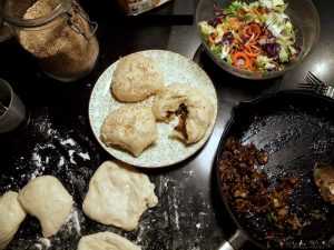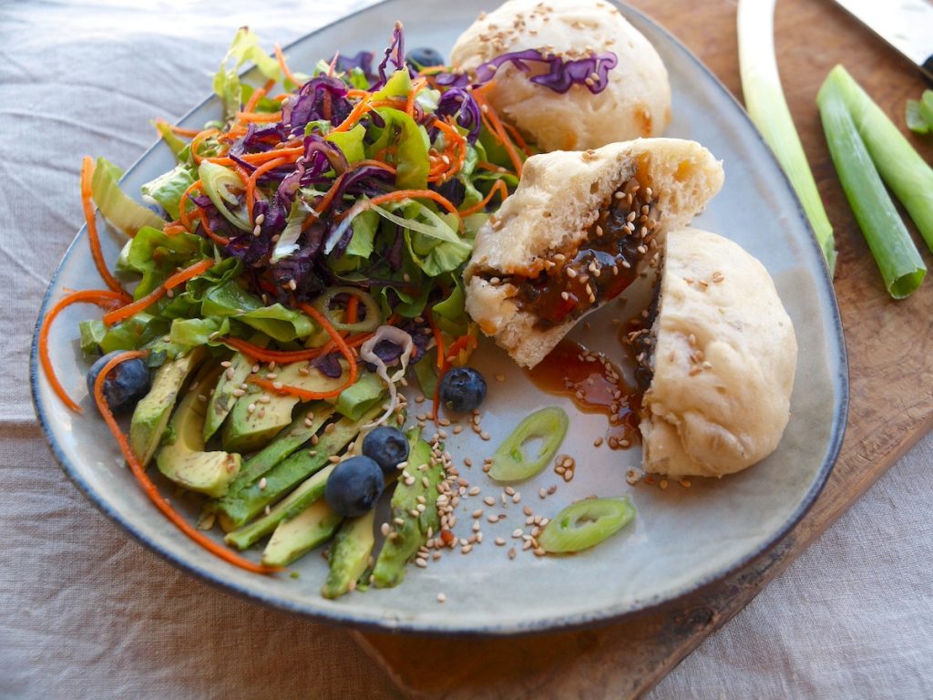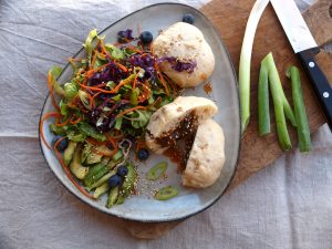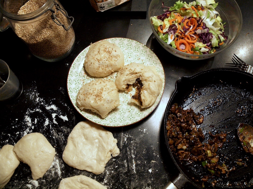 Bao sind taiwanesische gedämpfte, gefüllte Teigtaschen und keine Brötchen, als was sie fälschlicherweise oft bezeichnet werden, auch wenn sie so aussehen. Sie werden in Asien gerne als Snack verzehrt. Seitdem wir dieses Rezept in dem Buch „Veganuary“ entdeckt und probiert haben, sind sie auch bei uns begehrt. Ich denke, das liegt unter anderem an dem süßlichen, weichen, sehr gefälligen Teig, der mit einer aromatischen, süß-scharfen Pilzfüllung überaus lecker schmeckt. Ich besitze zwar keinen Bambus-Dampfkorb, den man für die Zubereitung eigentlich bräuchte, habe aber mit dem Dampfeinsatz eines Schnellkochtopfes improvisiert, was tadellos geklappt hat.