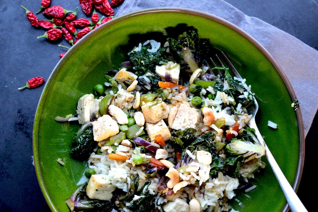 Gestern auf dem Markt war ich hoch entzückt, als ich beim Gemüsebauern Kohlröschen und Schwarzkohl entdeckt habe. Die Kohlröschen habe ich zu Hause sogleich verarbeitet. Der Schwarzkohl muss noch warten. Da im Moment sowieso wenig Zeit für alles ist, wollte ich ein schnelles Gericht zubereiten. Ich hatte noch Basmatireis vom Vortag im Kühlschrank und habe mir zum Kohl noch anderes Gemüse gesucht. Bunt sollte es sein. Ich habe mich für grüne Paprika, Erbsen, eine Handvoll Spinat, Möhre und Zwiebeln entschieden. Tofu und Cashews machen satt und sind einfach lecker dazu. Mit Ingwer und Chili wird es rund. Das Gemüse wird zuerst im Schmortopf gegart, dann kommt der Reis dazu und soll eigentlich eine kleine Kruste am Topfboden bekommen. Dafür muss man einfach kurz die Nerven behalten.