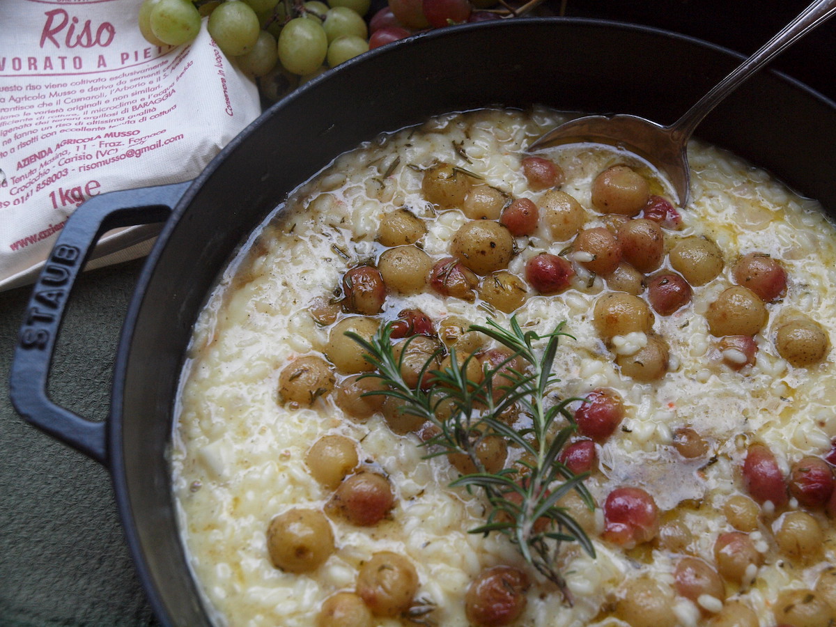 Dieses raffinierte Risotto ist geschmacklich sehr fein, denn die süßlichen Trauben, der herzhafte Käse und ein Hauch von Rosmarin stehen gleichberechtigt nebeneinander und stehlen sich nicht gegenseitig die Show. Ich hatte das Glück, sehr leckere, knackige Bio-Tafeltrauben zu erwischen, die ihren Biss auch im Ofen noch behalten haben.