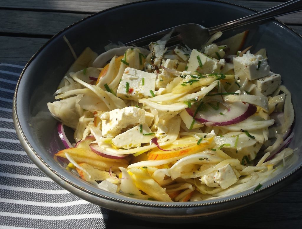 Diese Sommervariante des Fenchel-Salats wird mit Apfel zubereitet. Ich finde, je feiner das Gemüse und der Apfel geschnitten sind, desto besser schmecken sie. Das gilt nicht nur für diese Rohkost, sondern für viele andere Gerichte auch. Die Anschaffung eines guten Hobels, der die Knollen richtig schön und leicht schneidet, lohnt sich einfach.