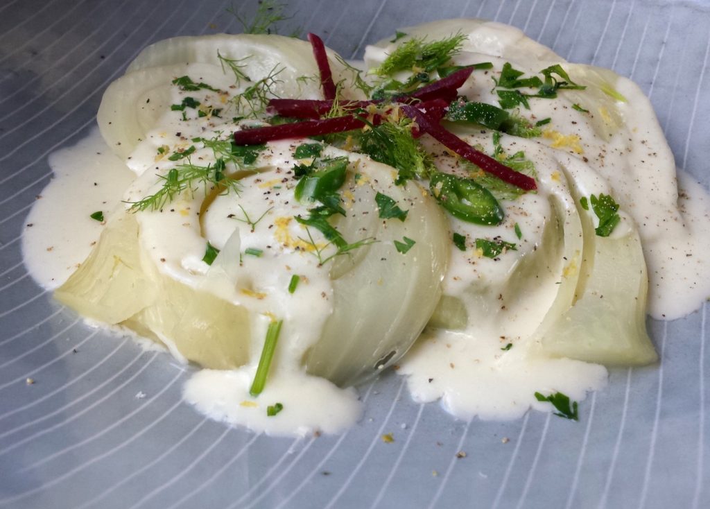 Fenchel auf einem Teller anrichten, mit der Sauce übergießen, dann Fenchelgrün und Petersilie sowie die Chiliringe und Rote-Bete-Stifte darüber verteilen. Mit Zitronenabrieb bestreuen, eventuell nochmal pfeffern.