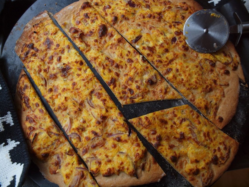 Das wäre doch gelacht, wenn ich meinen Kürbis alleine essen müsste. Darauf habe ich keine Lust. Also habe ich mir als „Verpackung“ diesmal einen Flammkuchen ausgedacht, hauchdünn und mit geraspeltem Kürbis belegt. Menschen, die anders als meine Kinder Kürbis gerne essen, können ihn auch in dünnen Scheiben oder klein gewürfelt verwenden. Aber dabei bitte beachten, dass die Garzeit recht kurz ist.