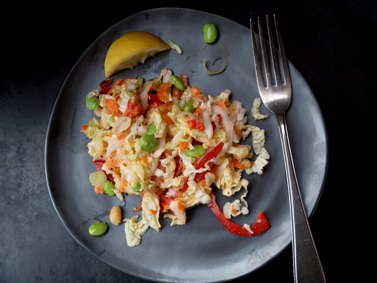 Diesem Salat gebe ich eine süß-fruchtige Note mit leichter Chili-Ingwer-Schärfe und sorge mit Erdnüssen und Edamame-Bohnen (aus dem Tiefkühlfach) für Biss und geschmackliche Farbe. Das allerwichtigste dabei ist, ihn sofort zu essen, nachdem das Dressing verteilt wurde, denn er zieht schnell Wasser und fällt dann zusammen