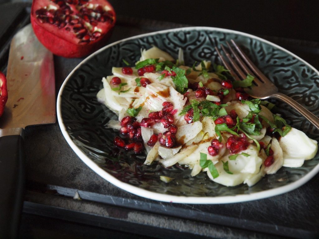 Also, egal ob schwanger oder nicht: ran an die Knolle! Der milde Geschmack des Fenchels harmoniert perfekt mit den fruchtig-süßen Granatapfelkernen, die übrigens nicht nur sehr dekorativ aussehen, sondern viele sekundäre Pflanzenstoffe mit entzündungshemmenden und antioxidantischen Effekten mitliefern. Übersetzt heißt das: sie halten uns jung.