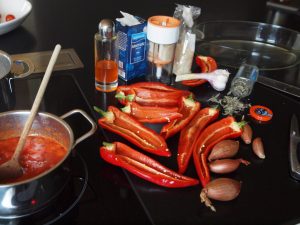 Zutaten: 4 – 5 rote, möglichst dünnwandige und nicht zu große Paprikaschoten, 150 – 200 g Quinoa, 400 ml pürierte Tomaten (frisch oder aus der Dose), 150 g geriebenen Käse (z.B. Appenzeller), 3 Schalotten, 1 Knoblauchzehe, Oregano, Olivenöl, Salz, 1 Prise Zucker, Chiliflocken, Pfeffer, 50 g geriebenen Parmesan, frisches Basilikum
