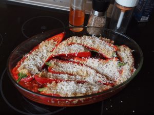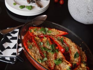 Nun kommen die Auflaufform und die Paprikas ins Spiel. Die Schoten durch die Stielansätze hindurch halbieren, die Kerne herausschneiden. Die Tomatensauce in die Form füllen. Dann die Paprikahälften mit der Quinoamischung füllen, eng an eng auf die Tomatensauce setzen und mit Parmesan bestreuen.