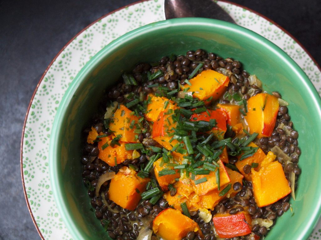 Wenn man eine Kürbissuppe in Arbeit hat, legt man einfach ein bisschen was vom Fruchtfleisch beiseite und nutzt es als bunten Begleiter zu den leckeren, schwarzen Linsen.