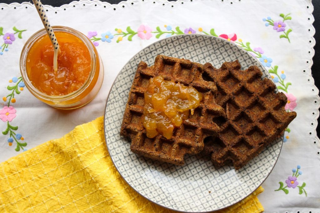 Was hier so nach Schokolade aussieht ist in Wirklichkeit ein dunkles Buchweizenvollkornmehl, das ich aus Italien mitgebracht habe. Da hatte ich wohl mal wieder einen meiner vernunftbetonten Vollkornanfälle, wie sie ab und zu mal vorkommen. Bei uns ist eher das helle verbreitet, das feiner im Geschmack ist. Aber damit konnte ich meine süße Waffelvariante wenigstens guten Gewissens kreieren. Ich habe ihr ganz viel Zimt eingehaucht, das durch die Wärme beim Backvorgang wunderbar zu duften beginnt. Die Waffeln habe ich mit viel fruchtiger Orangenmarmelade gegessen. Ein Genuss! Sogar mein Mann hat sich entgegen seiner Vorlieben darüber hergemacht – mit süßer Erdbeermarmelade. Noch vernünftigere Menschen greifen zu Apfelmus.