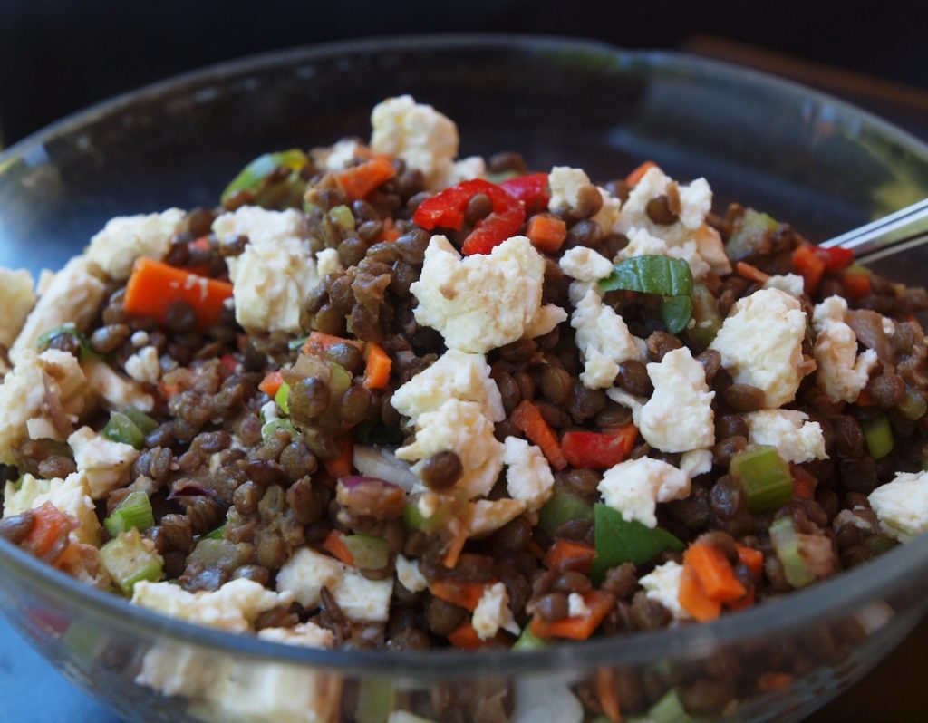Schon als ich die noch warmen Linsen mit der Vinaigrette vermischt habe, wusste ich, ich hätte eine größere Portion machen sollen. Von einem guten Linsensalat kann man nämlich nie genug bekommen, auch nicht von diesem, den uns unsere Freundin Karin ans Herz gelegt hat.