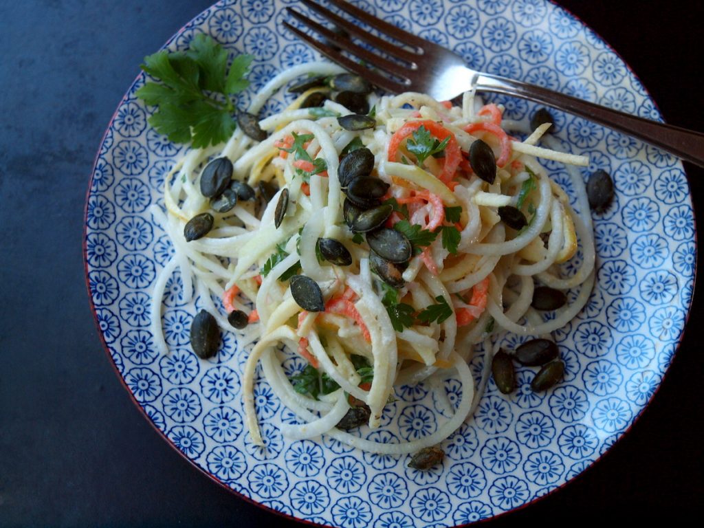 Dieser Rohkostsalat ist so fruchtig und frisch, dass er von allen gerne gegessen wird. Er hat Biss und eine schön nussige Note durch die gerösteten Kürbiskerne, er ist knackig, leicht und ganz unkompliziert in ein paar Minuten zubereitet
