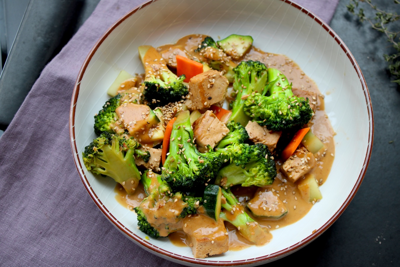 Laut meinem Geschmacksthesaurus, einem dicken Werk über die besten Geschmackskombinationen, ergänzen sich der süßliche Brokkoli und crunchiges Erdnussmus aufs Allerfeinste. Ich muss ihm recht geben. Seitdem ich zum ersten Mal Brokkoli mit Erdnusssauce gegessen habe, hat sich mein Wohlwollen zugunsten des grünen Gemüses deutlich gewandelt. Ich glaube auch, das meiner Kinder. Deshalb möchte ich diese Paarung ein weiteres Mal in Erinnerung rufen, ausserdem kann man sie mit Tofu, Reisnudeln oder anderen Gemüsesorten zubereiten. In zehn Minuten steht das Gericht auf dem Tisch. Und ich finde, es passt zu jeder Jahreszeit.