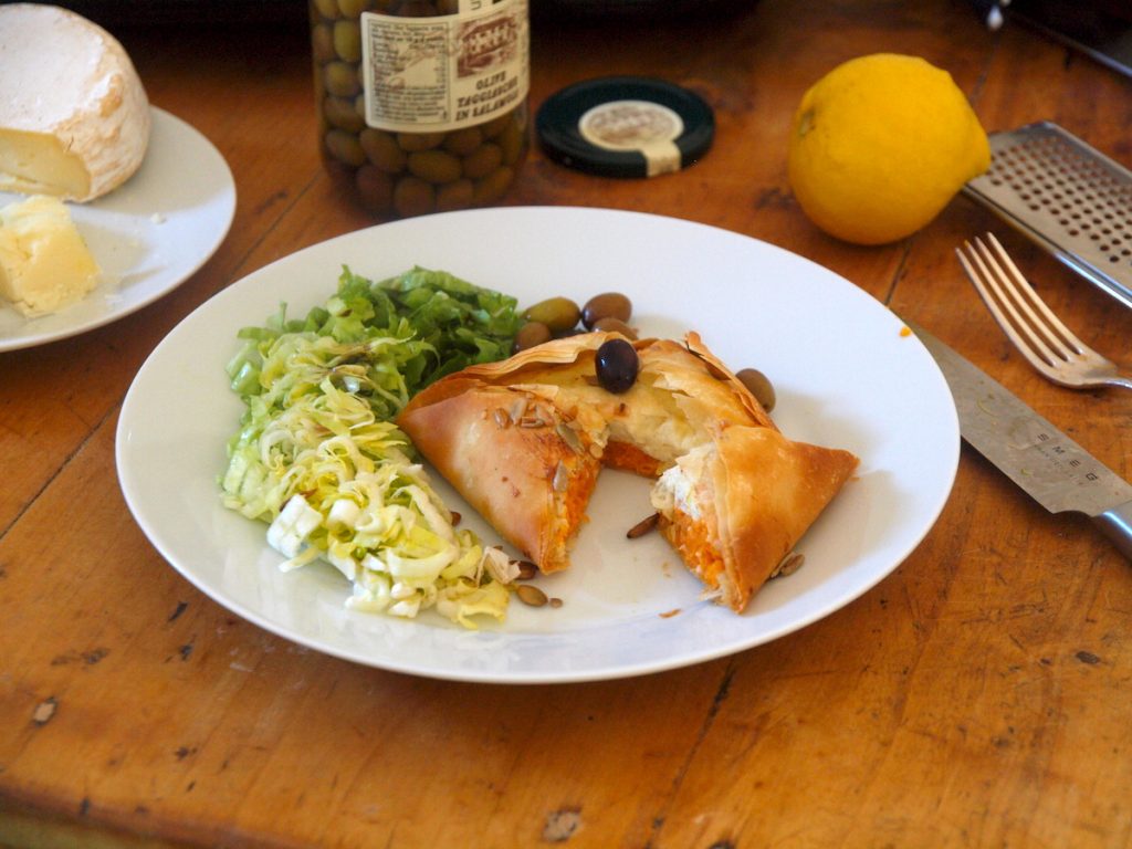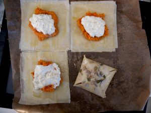 Hat man seine 4 Filoteigstapel, verteilt man zuerst die Süßkartoffelmasse und setzt dann die Käsemischung darauf. Die vier Ecken eines jeden Teigstapels werden nun zur Mitte hineingeklappt, sodass ein Päckchen entsteht. Mit der Saatenmischung bestreuen. Auf Backtrennpapier im Ofen für 20 Minuten backen.