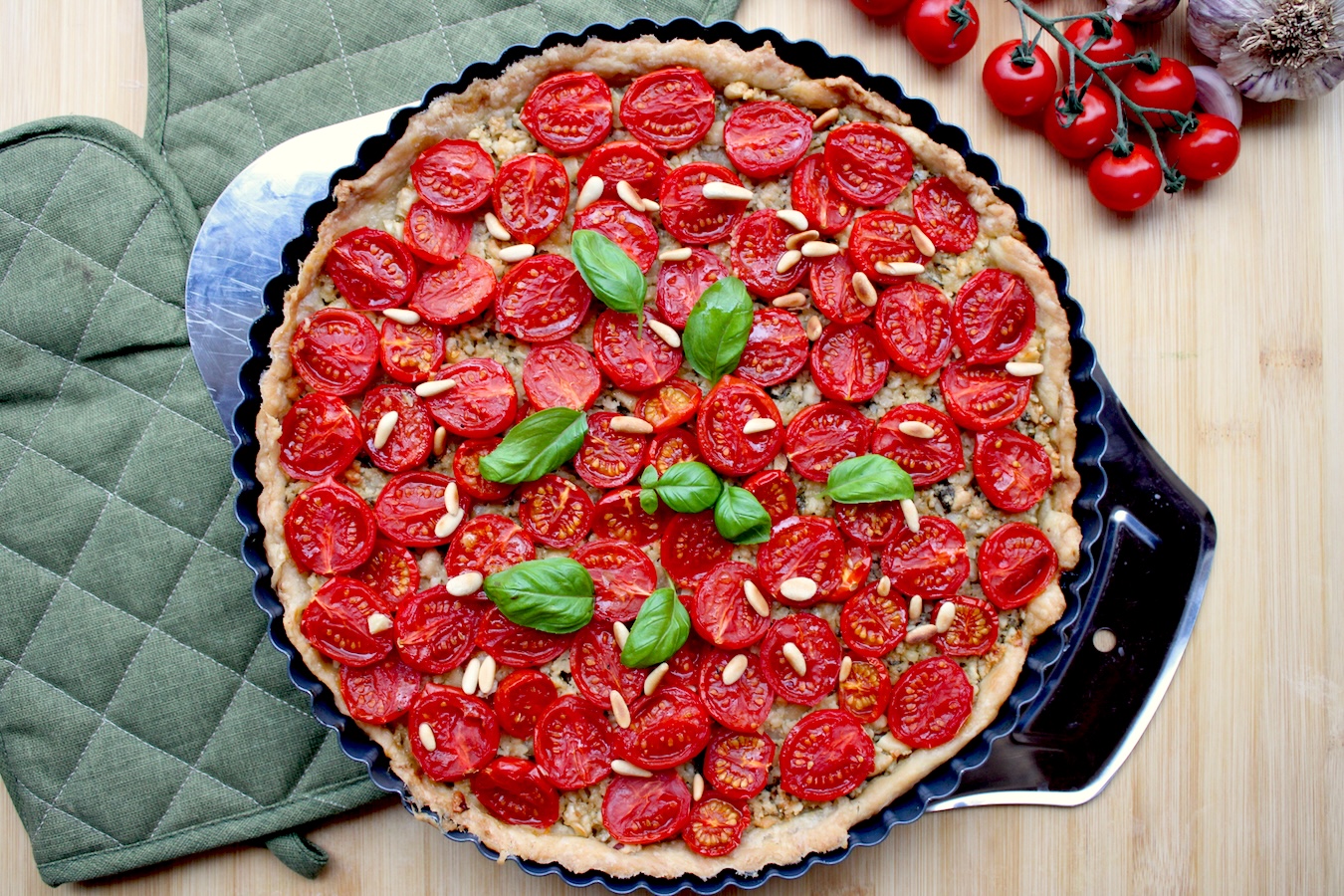 In letzter Zeit gab es diese Tarte schon mehrfach. Und jedesmal ist sie im Nu weg. Kein Wunder, denn sie schmeckt wirklich toll. Sie besteht aus einem knusprigen Mürbeteigboden, einer aromatischen Cashew-Basilikum-Schicht und süßlich-fruchtigen Tomaten. Das ist alles! Ihr wisst ja, die einfachen Rezepte sind oft die besten.