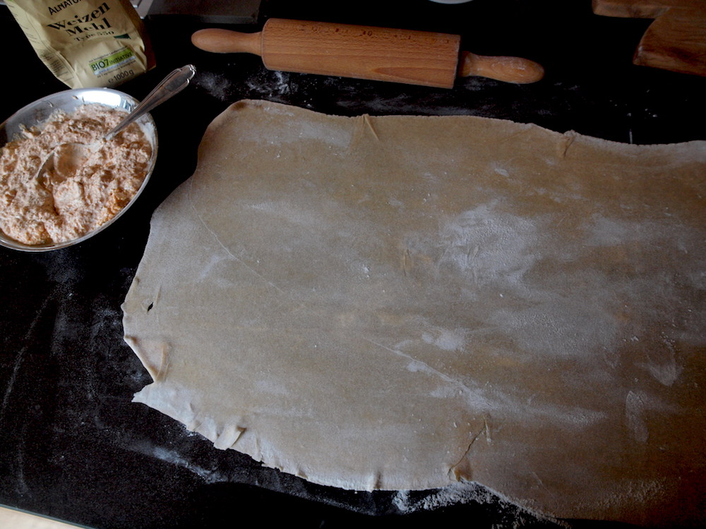 Den Teig 1 Stunde in Folie gewickelt ruhen lassen, dann ca. 250 g vom Teig abnehmen und auf einer bemehlten Arbeitsfläche mit dem Nudelholz schön dünn ausrollen, optimal in der Größe 30 x 60 cm.