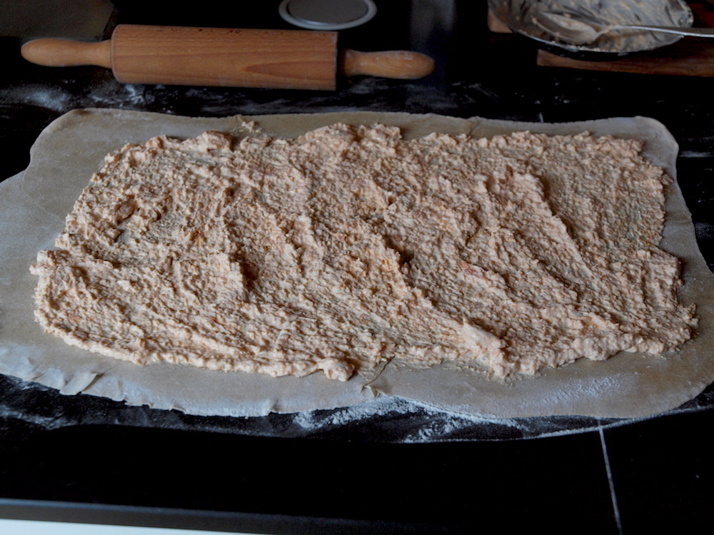 Die Füllung auf dem Teig verteilen. Dabei am linken, kurzen Rand etwa 15 cm frei lassen, oben und unten an den langen Seiten etwa 5 cm. Diese nach innen einschlagen und den Teig von rechts nach links vorsichtig und möglichst kompakt aufrollen.