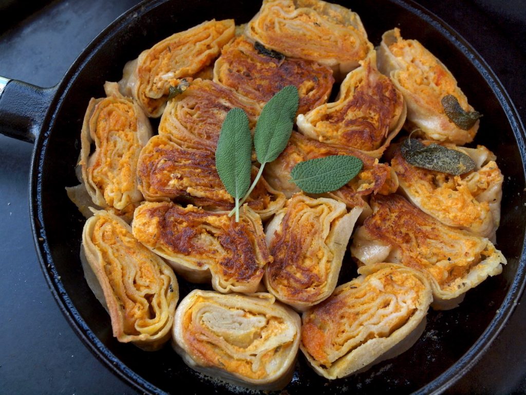 Diese gefüllten Nudel-Schnecken könnten bei uns auch unter Krapfen laufen, in Italien sind es Rotolini, und sie sind dementsprechend zubereitet: mit einer Mischung aus Kürbis und Ricotta, angebraten in Salbei-Butter. Den Teig kann man fertig kaufen, selbstverständlich, aber auch einfach selber machen und dünn ausrollen. Ich habe dafür etwas mehr gemacht und den Rest zu Bandnudeln für den nächsten Tag verarbeitet.