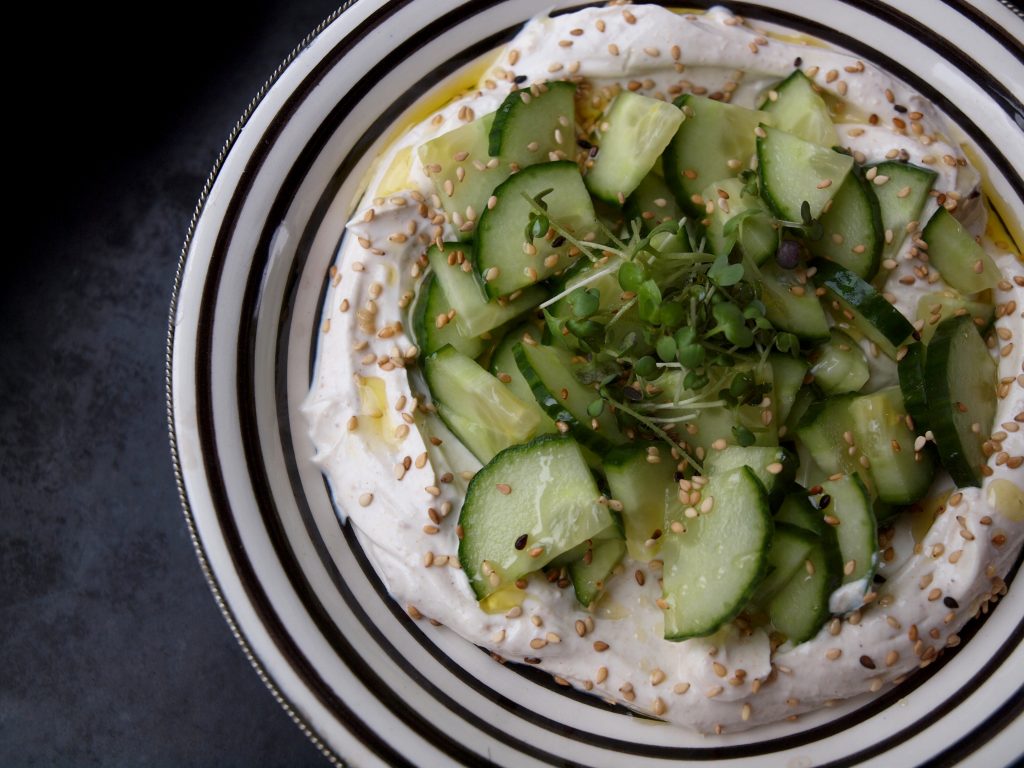 Das Labneh mit einem Esslöffel in eine flache Schüssel streichen und die Gurken darüber verteilen. Sesam, Öl und Kräuter dazu. Fertig