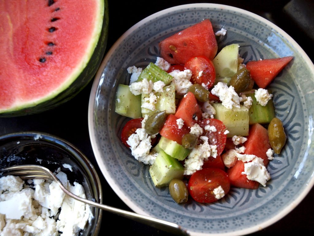 Ein guter Sommersalat, der frisch und fruchtig ist und an dem mir besonders die Kombination aus süß und salzig gefällt, also von Melone und Honig-Ziegenfrischkäse einerseits und Gurke, Tomate, Kapern andererseits.