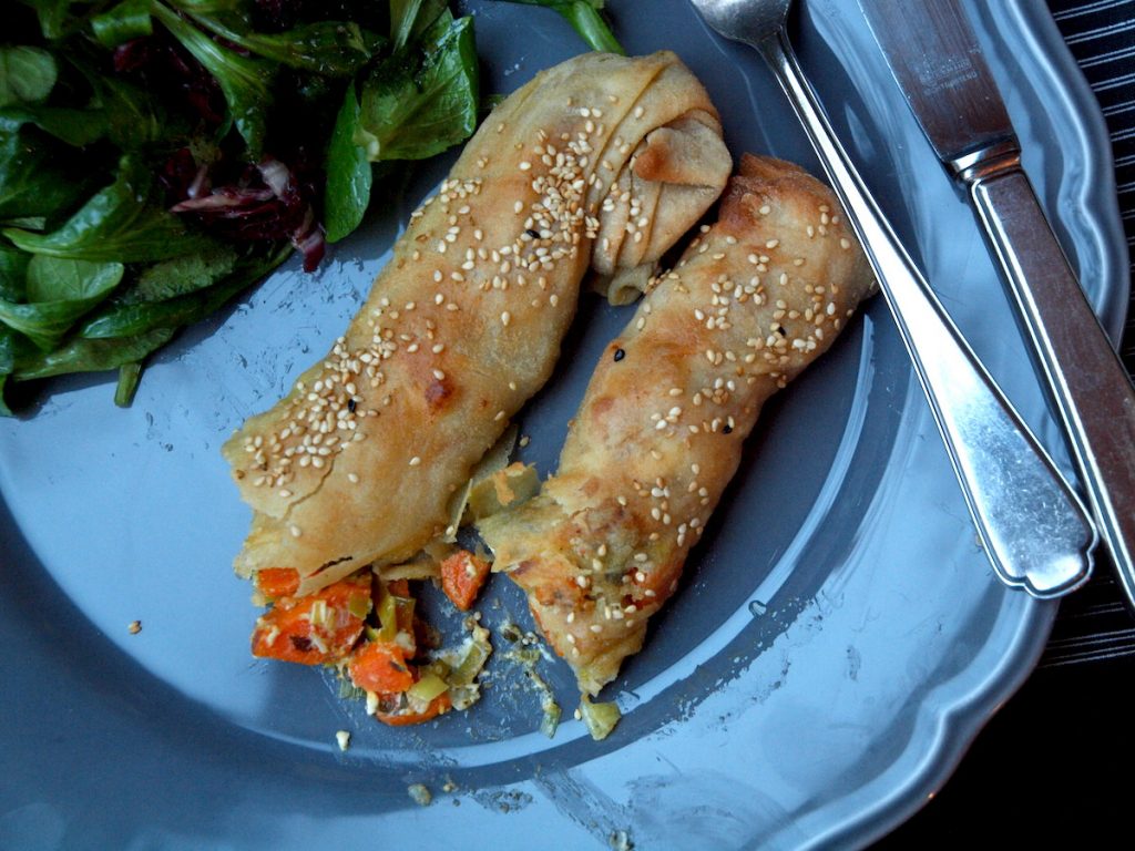 Auch Spitzenköche vertun sich manchmal. Hätte ich mich an die Anleitung von Vincent Klink gehalten, wäre das Rezept nie und nimmer was geworden, denn der Teig war viel zu klebrig und die Füllung wäre nur halb fertig gewesen. Ich habe das Buch dann einfach zugeklappt und einiges verändert, Käse hinzugefügt und dabei herausgekommen sind diese schön mit Kreuzkümmel und Koriander gewürzten Möhren-Schafskäse-Röllchen.
