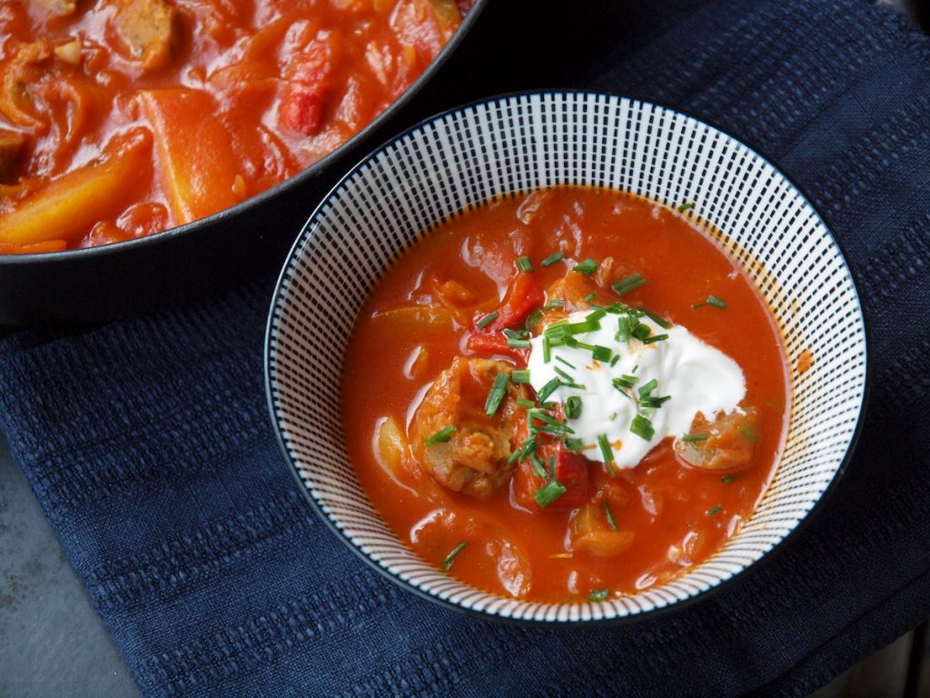 Wer frisches Sauerkraut liebt, kann es für diesen Eintopf gerne verwenden, der dann allerdings relativ sauer wird. Mit mildem Sauerkraut geht man dagegen kein Risiko ein, das fügt sich wunderbar in die Tomatenbasis und schmeckt hervorragend zu den Paprika- und Kartoffelschnitzen.