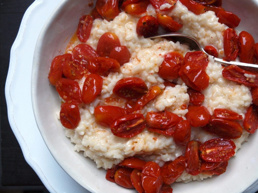 Wir sollten den Sommer nutzen, um den Geschmack der reifen Tomaten zu genießen. Bei diesem Risotto, das ich für Freunde gekocht habe, kommen sie besonders gut zur Geltung. Anders als bei einem Tomaten-Risotto, das insgesamt sehr „tomatig“ und fruchtig schmeckt, hat man es hier mit einem cremigen Risotto mit süßlich-aromatischen Geschmacksspitzen zu tun, und es ist somit ein wenig raffinierter.