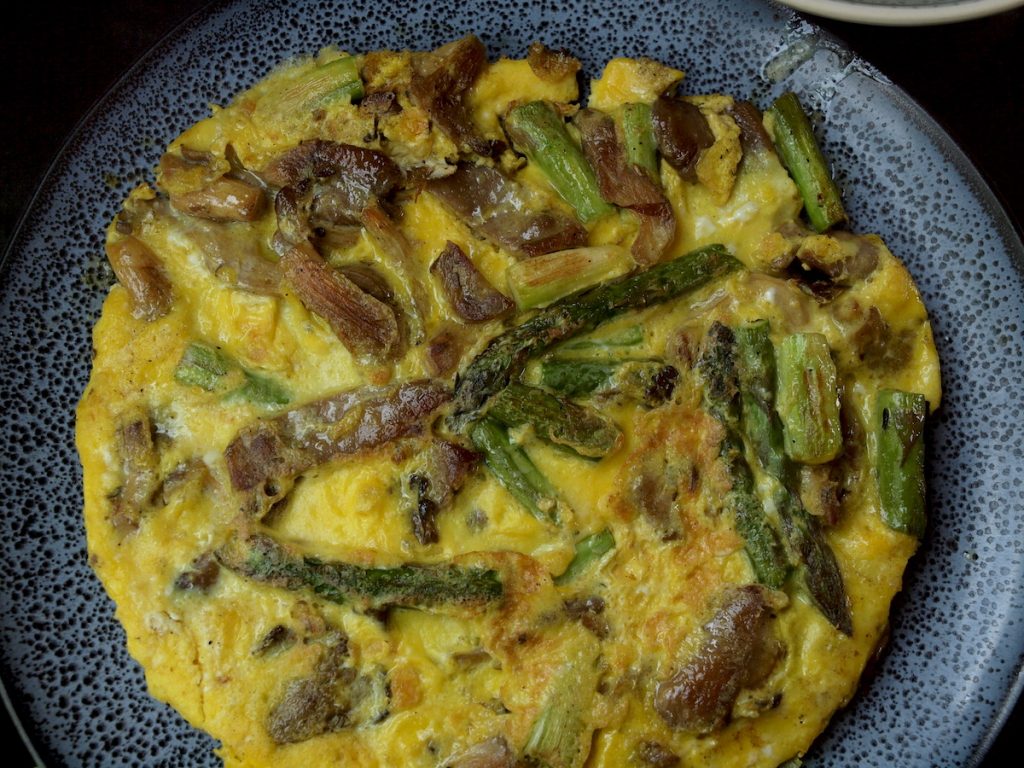 Eine gusseiserne Pfanne mit 2 EL Butter darin erhitzen, Zwiebeln, Austernseitlinge und Spargel darin langsam anbraten bis sie Farbe annehmen, eventuell nochmal etwas Butter hinzufügen, bevor man das Ei darüber verteilt und stocken lässt.