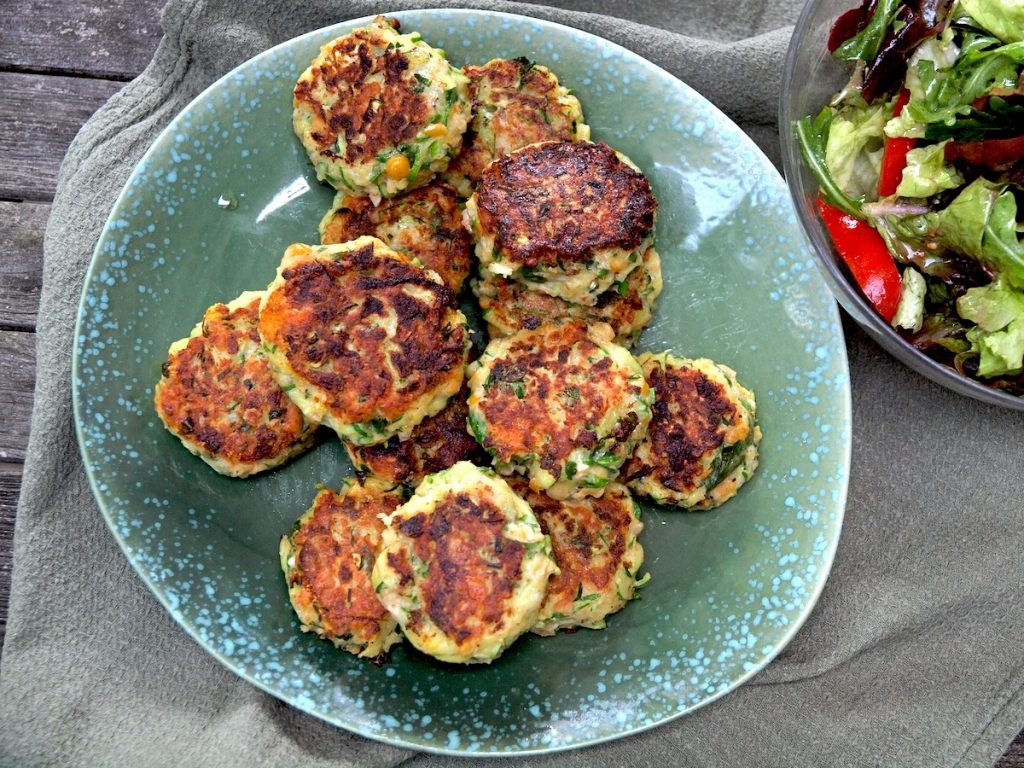Alle Zutaten in einer Schüssel vermischen, gut mit Salz und Pfeffer abschmecken, Küchlein formen und in Bratöl von beiden Seiten goldbraun anbraten.