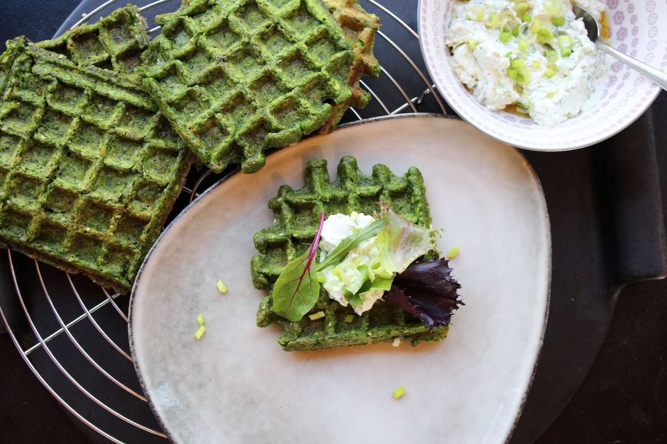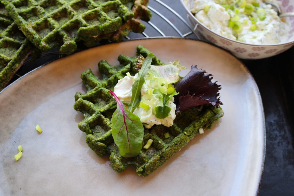 Dazu mache ich eine Rucola-Quark, fülle ihn auf die Waffeln und streue in paar Blättchen Salatmix und Frühlingszwiebeln darüber. Praktischerweise kann man sie gut zusammenklappen und isst sie einfach so aus der Hand. Lecker!