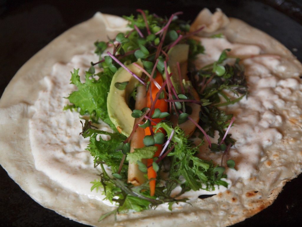 Um den Wrap fertigzustellen, bestreicht man ihn mit gut 1 EL der Tahini-Crème, verteilt etwas Füllung in der Mitte und salzt das Gemüse ein wenig. Nun klappt man die Seite von oben und unten ein und rollt den Wrap nun von der linken oder rechten Seite her möglichst fest zu einer Rolle. Einmal in der Mitte schräg durchschneiden.