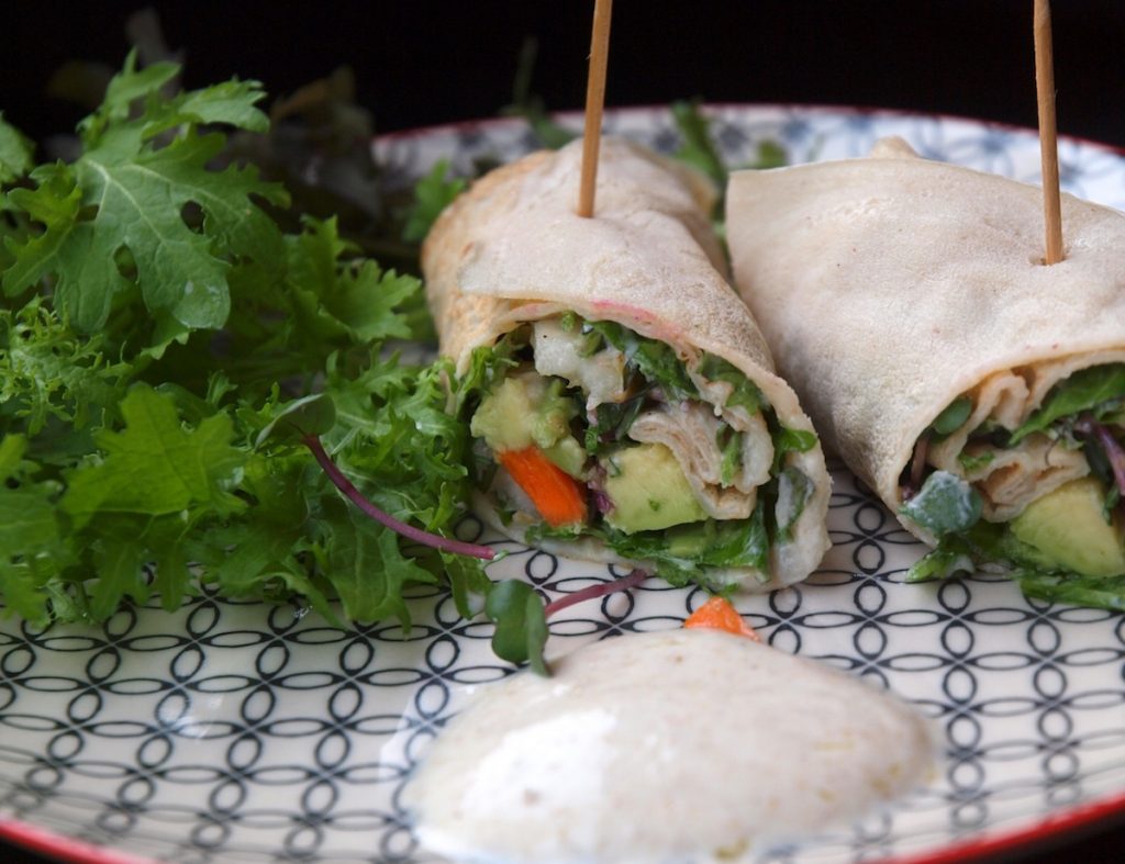 Die Wraps habe ich diesmal selbst gemacht, weil mir die gekauften nicht wirklich schmecken und mich immer irgendwie an Pappe erinnern. Außerdem zerbrechen sie so leicht und sind für meinen Geschmack zu trocken. Das Teigrezept habe ich mir in einem (sonst langweiligen) veganen Kochlehrgang abgeschaut. Dort wurde es selbstverständlich ohne Ei gemacht.