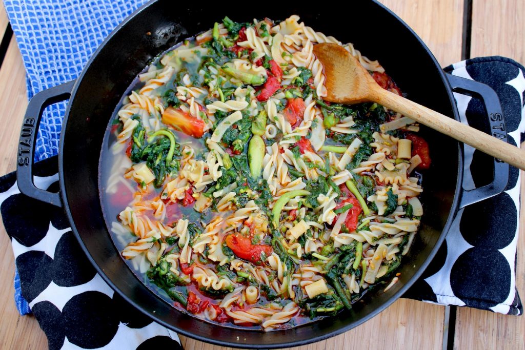 Das Kochwasser durch ein Sieb abgießen und auffangen. Nudeln mit Tenerumi zu den Tomaten geben und gut mischen. Mit etwas Kochwasser auffüllen, sodass eine dicklichere Suppe entsteht. Mit etwas Zitronenabrieb aromatisieren.